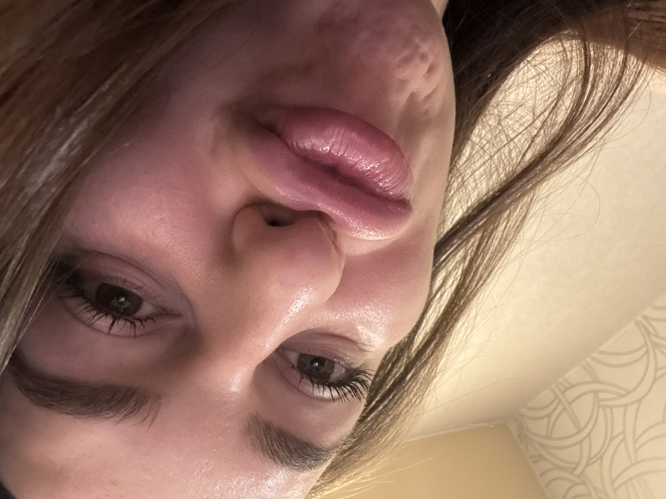 This image captures a close-up, diagonally angled view of an individual's face, presumed to be an indoor setting in Apatity, Russia. The subject is a female with fair skin, brown eyes, and dark eyebrows. Her dark brown hair is visible along the lower right side of the frame. Her lips are full and puckered into a pout, appearing glossy with a pink hue. Visible skin texture includes highlights on the forehead, nose bridge, and around the mouth, along with some indentations on the lower right cheek area. The background is blurred, revealing a light-colored wall with a faint, repeating geometric pattern (interlocking circles) visible on the left side. No other individuals or distinct objects are discernible. The action depicted is a static pose for a photograph.