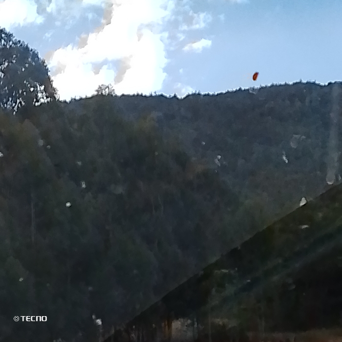 The image presents a natural landscape, reportedly located in Kola ward, Kenya, featuring a large, tree-covered hillside under a partially cloudy sky. The majority of the frame is occupied by the dark green to grey hillside, densely vegetated with trees, whose irregular crest is silhouetted against a light blue sky containing prominent white cumulus clouds. In the upper right quadrant of the sky, a small, reddish-orange, ovoid object is observed floating above the hillside's peak. The lower portion of the image is dark and indistinct, showing a diagonal linear element that may represent a foreground structure or slope. Numerous small, light-colored, irregularly shaped specks are distributed across the image, consistent with lens artifacts or reflections. A "© TECNO" watermark is visible in the bottom-left corner. No individuals, specific actions, or interactions are discernible within the scene.