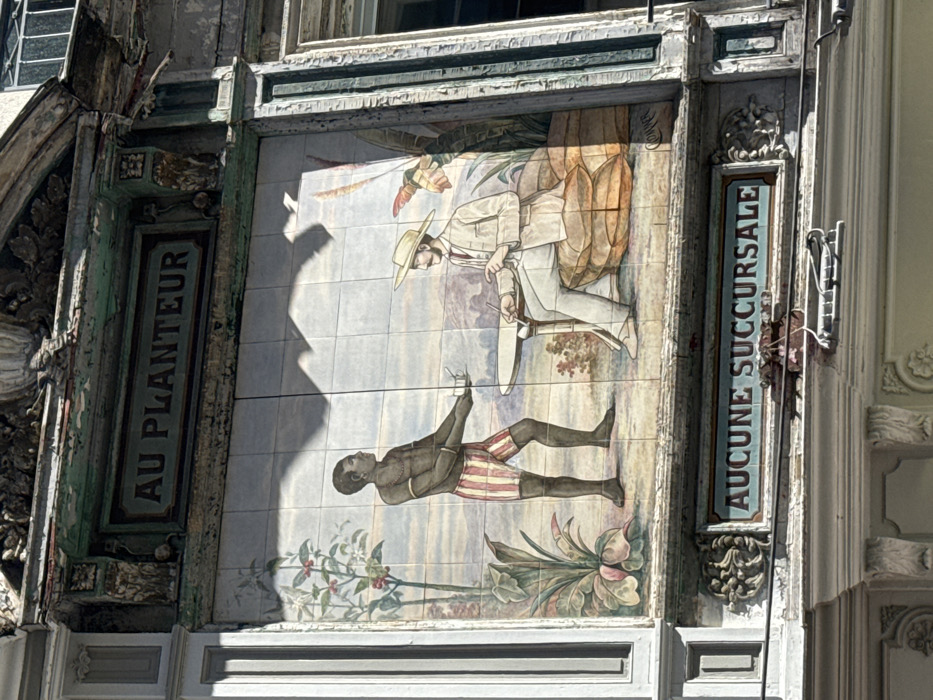 - "A tiled mural depicting a colonial-era scene is embedded in the weathered facade of a building located at 10 Rue des Déchargeurs, Paris, France" by FM-ilC4O2, licensed under CC BY 4.0