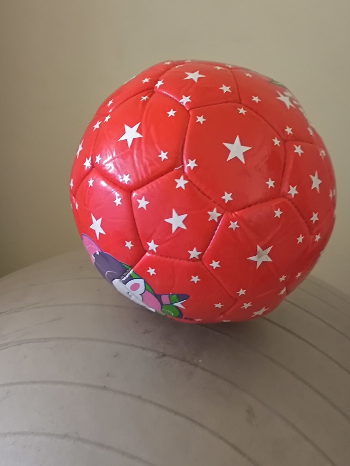 A red soccer ball with a glossy finish is depicted, featuring a pattern of numerous white five-pointed stars of varying sizes stitched onto its hexagonal and pentagonal panels. A partial cartoon graphic is visible on the lower-left section of the ball, depicting a stylized animal head with purple and pink elements, possibly wearing a green accessory. The ball rests on a light beige or grey surface characterized by parallel, horizontal, and slightly curved ridges or grooves, suggesting a textured object such as an exercise ball or similar large spherical item. The background consists of a plain, uniformly light beige or off-white wall, slightly out of focus. No other objects or individuals are present. The scene is illuminated by diffuse, ambient light. The image provides no discernable visual information to determine a specific geographic location within Nicosia, Northern Cyprus, or Cyprus.