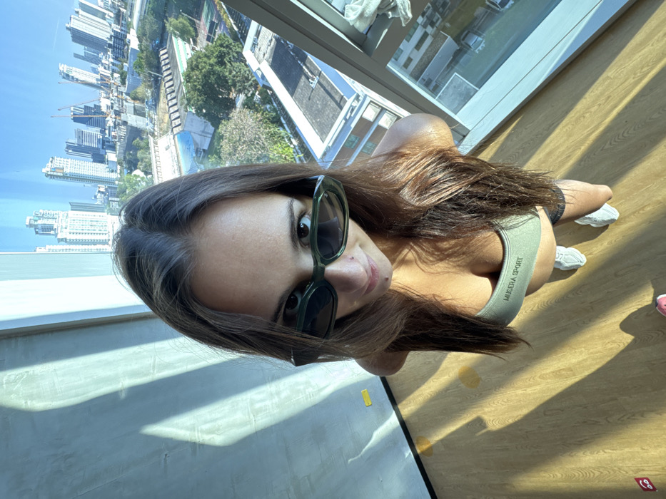 A wide-angle, low-angle photograph captures a female subject standing indoors on a light wooden floor, looking directly into the camera. She has long, dark brown hair and is wearing dark green oval-shaped sunglasses that obscure most of her eyes. A silver stud nose piercing is visible on her left nostril. She wears an olive green sports bra with "MUSERA SPORT" printed on it, dark shorts, and white athletic shoes. Strong sunlight enters from the right, creating multiple vertical shadow lines across the wooden floor and a textured grey wall to her left. Yellow tape markers are present on the wall and floor, along with a red circular sticker on the floor. To the subject's right, a large window provides an expansive view of a metropolitan skyline under a clear blue sky. Numerous high-rise buildings, including residential and commercial towers, are visible in the background, some with visible construction cranes. In the middle distance, a prominent light blue-roofed complex with multiple parallel roof sections is discernible, adjacent to a large, light-colored rectangular area, possibly an outdoor swimming pool or sports facility, surrounded by green foliage and other lower-rise buildings. This specific urban layout, featuring the distinctive blue-roofed structures and extensive sports/university grounds amid high-rise development, identifies the location as the **Pathum Wan district of Bangkok, Thailand**, likely overlooking the vicinity of the **National Stadium** or **Chulalongkorn University**.