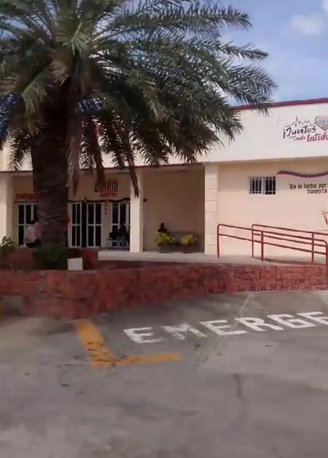 exterior of a building with the words "BARRIO ADENTRO" and "EMERGENCIA" visible. There are palm trees in front of the building, and a parking lot with yellow lines is visible. People are standing and sitting near the entrance of the building. The sky is blue with some clouds. The video is shot during the daytime.