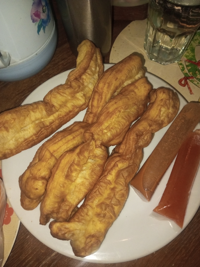 The scene is an indoor setting on a dark wooden table in Kodarapalli, India. A white, oval plate centrally features eight golden-brown, deep-fried dough sticks, exhibiting twisted and elongated forms. Adjacent to the dough sticks on the plate are two clear plastic pouches containing condiments: one with a reddish-brown substance and the other with a reddish-orange substance. In the upper left background, a partial view of a white thermos with a blue base and a floral pattern is visible. A metallic vessel is positioned in the upper center background. To the upper right, a clear glass tumbler containing liquid rests on a cream-colored placemat with a visible festive design. No individuals are present.