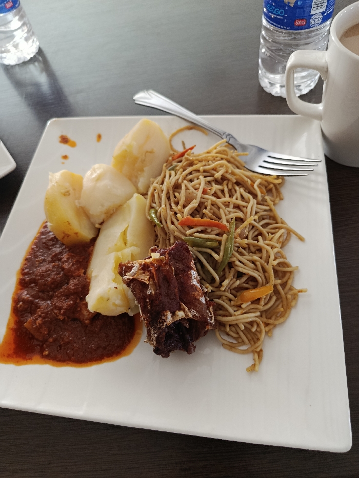 A square white plate holds a meal of noodles, boiled potatoes, and a dark red stew. The noodles are mixed with slivers of vegetables. A piece of fried fish lies next to the potatoes. A fork rests on the noodles. A bottle of water and a white mug are on the table beside the plate.