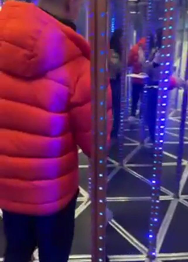 A man in a bright red puffy jacket, black pants, and white sneakers is walking inside a mirror maze. The maze's floor has a pattern of white triangles with black edges. The mirrors are framed by vertical strips with blue LED lights. The man appears to be feeling his way through the maze, using his hand to check for solid surfaces. His reflections appear multiple times in the surrounding mirrors, creating a disorienting effect.
