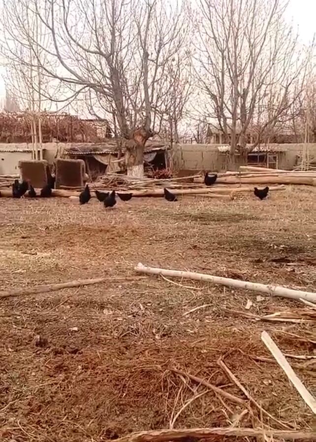 flock of black chickens in a rural setting. The ground is covered in dry grass and straw. There are several bare trees in the background. There are some logs and other pieces of wood lying on the ground, along with a couple of square objects near a building. The chickens are scattered around the yard. The camera moves slightly to get a closer view of the chickens. One of the chickens is a rooster with a red comb.