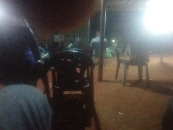 The scene depicts a blurry, low-light outdoor or semi-outdoor gathering at night in the city of Unknown, Unknown. The ground surface is reddish-brown dirt or sand. Artificial illumination is present, including a prominent, overexposed light source on the right causing significant lens flare. Vertical support poles are visible, suggesting a covered structure. Multiple dark-colored chairs, consistent with plastic outdoor seating, are distributed throughout the mid-ground and background, with one prominent chair positioned slightly left of center. In the lower-left foreground, the back and upper left shoulder of an individual wearing a light-colored shirt are visible. To the left, a partially obscured figure in dark clothing stands near what appears to be a motorcycle or bicycle. Further back on the left, another individual wearing a white and dark-patterned shirt stands near a support pole. Other indistinct figures and objects are visible in the blurry background, indicating a casual social environment.