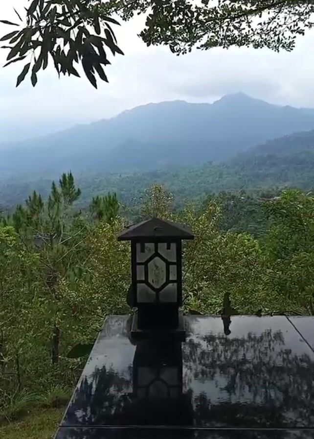 landscape with mountains in the background, obscured by a light fog or haze. In the foreground, there is a black table with a lantern on it, reflecting the surroundings. The lantern has a hexagonal design and is dark in color. The table surface is reflective, showing the image of the lantern and sky. The landscape is filled with green trees and foliage, giving the impression of a lush, natural environment. Above, branches with leaves frame the top of the shot. In the background music can be heard.