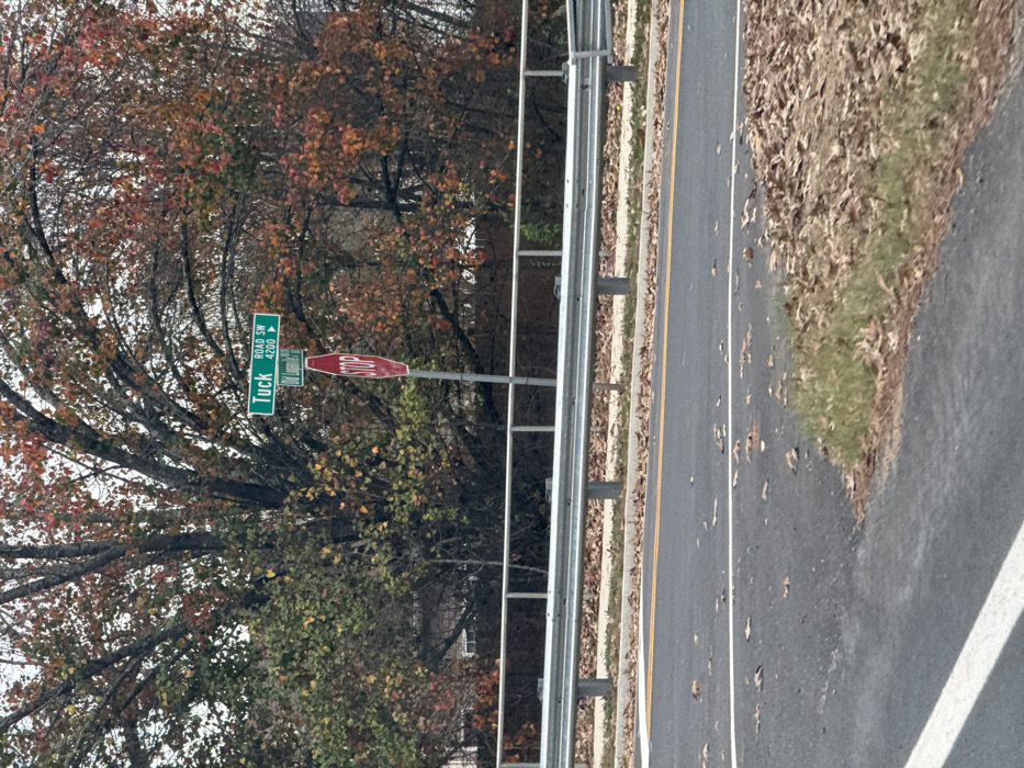 A street corner features a green street sign reading "Tuck" above another sign. Above that is a stop sign and a directional road sign indicates Road SW with the number 4200. The signs stand against a backdrop of trees with autumn-colored leaves. A guardrail runs alongside a road with white and yellow lines, and the roadside is covered with fallen leaves.