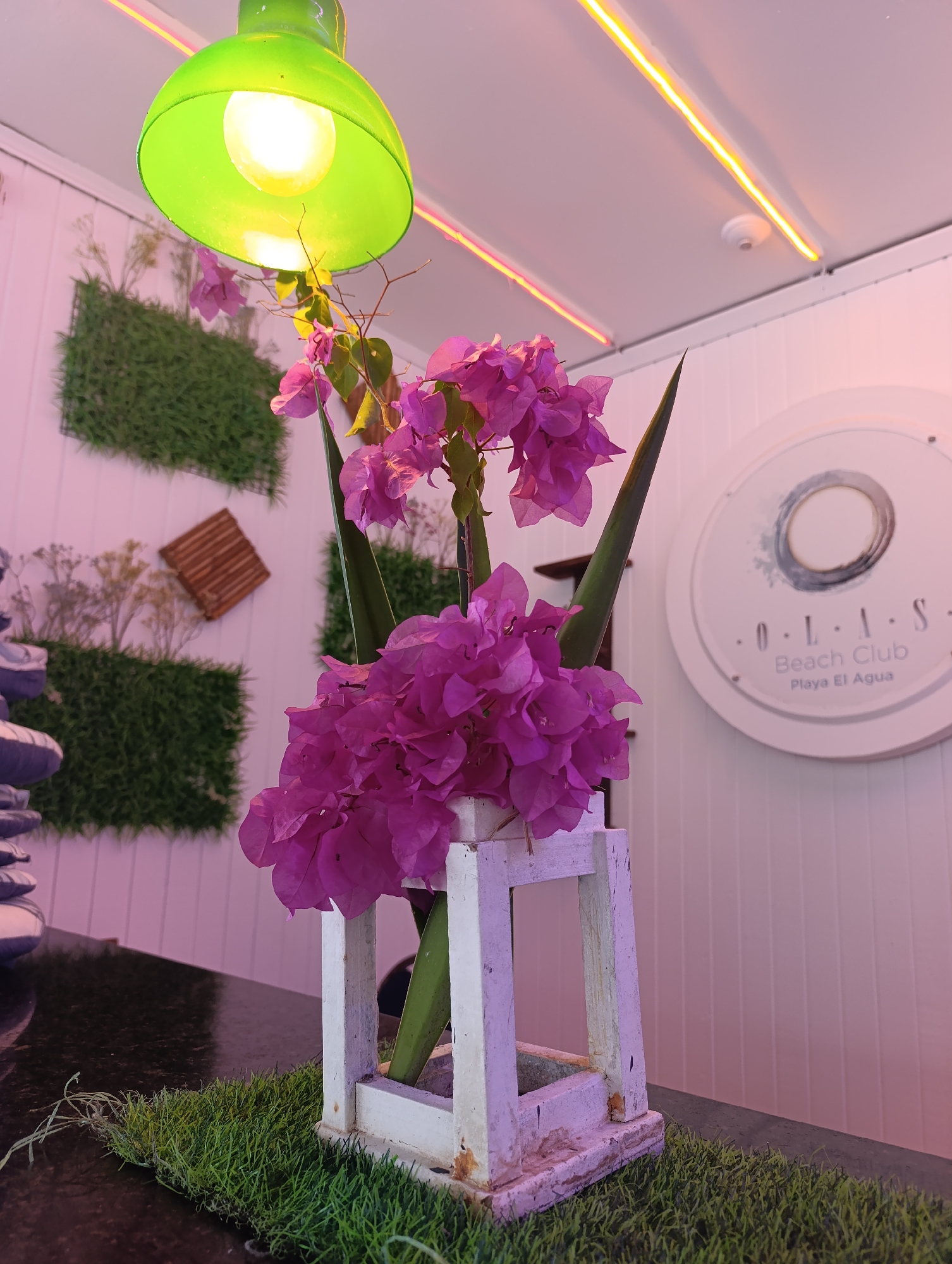 vase of pink bougainvillea flowers in a white wooden stand. The flowers are arranged in a decorative manner, with some branches extending upwards and others cascading downwards. The stand is placed on a surface covered with artificial grass. In the background, there is a white wall with vertical panels. Attached to the wall are decorative elements, including rectangular patches of artificial greenery and a small wooden grid. Above the flowers, a green lampshade illuminates the scene. On the right side of the frame, there is a white circular sign with the words "O.L.A.S. Beach Club Playa El Agua" written on it. The image is taken indoors.