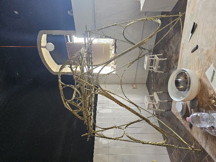 This image captures an indoor scene in Syracuse, Italy, featuring a large, intricate, organic structure centrally positioned. The structure is composed of numerous slender, light-colored bamboo or reed-like poles, intricately woven and tied to form an open, arched canopy. Its four main supports originate from the dark tiled floor and curve upwards to meet a complex, somewhat dome-like upper section. Within the bounds of this structure, two white, two-step stools are placed on the tiled floor. In the foreground, a wooden surface, likely a table or workbench, holds several objects: a partially filled clear plastic water bottle, a large white ceramic mixing bowl containing a smaller stainless steel bowl, a small white lid, a black-handled knife with its matching sheath, a small white rectangular tool, and a small pile of organic debris, possibly nut shells or food scraps. The lower sections of the visible walls are covered with white square tiles. The ceiling above is dark, potentially black, from which a single spherical light bulb hangs on an orange cord. In the background, an arched opening, possibly a window or doorway, reveals a brightly lit area beyond, suggesting an external view or an adjoining sunlit space. No individuals are present in the scene.