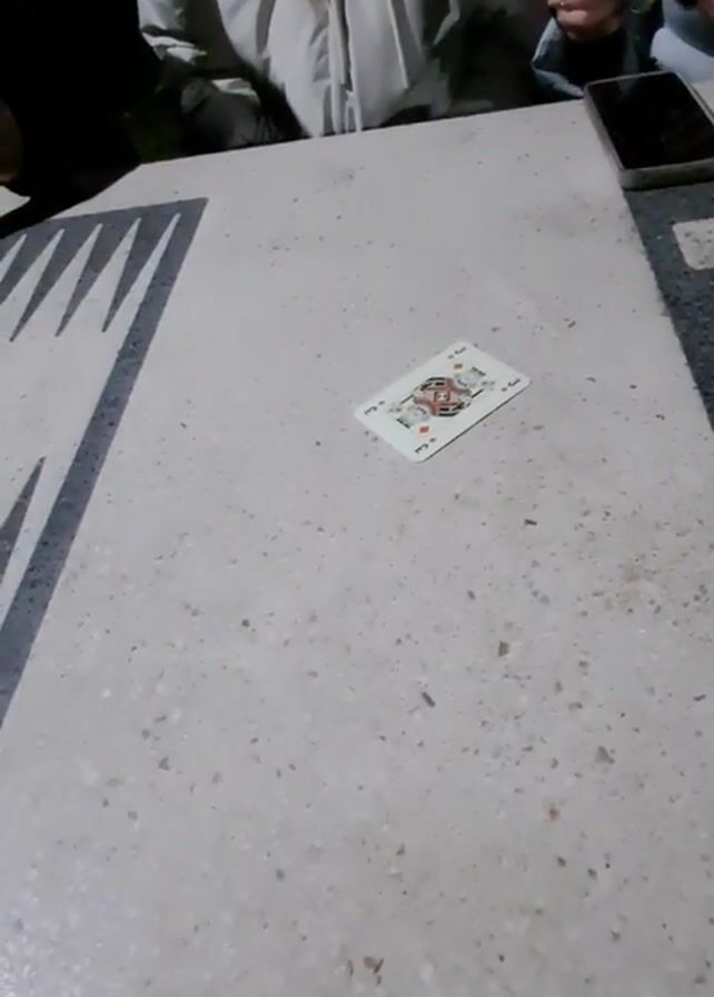 casual outdoor setting where people are playing cards on a light gray speckled tabletop. A person wearing a white puffer jacket is visible in the background, with another person partially visible on the right. One playing card, the Jack of Diamonds, lies face up on the table. A hand deals two additional cards on the table, one being an Uno card with a green background and the other being the 7 of Clubs. The table also has a design that resembles backgammon. A cell phone is situated on the right edge of the table. The video has low lighting, giving it a somewhat dark atmosphere.