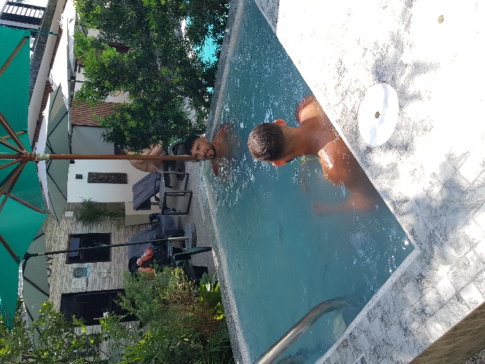 Two men are relaxing in a small, tiled pool, partially submerged in the clear water. One man faces the camera, while the other's back is visible. The pool is surrounded by a tiled edge and a stainless-steel handrail. Outside the pool area, there are lounge chairs, a green patio umbrella, and some lush foliage, including trees and bushes. A building is also seen in the background.