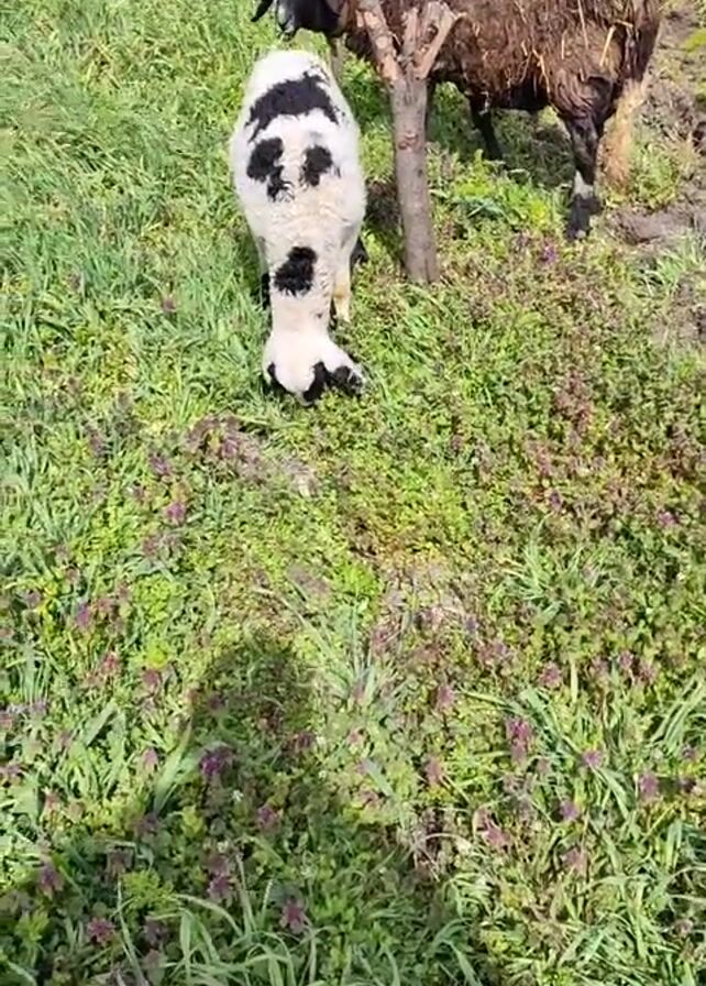 two sheep in a grassy field. One sheep is mostly white with black spots and is grazing. The other sheep is brown with a black head and is standing near a small tree. The field is covered in green grass and small purple flowers. The shadow of the person recording the video is visible in the foreground. The weather appears sunny.