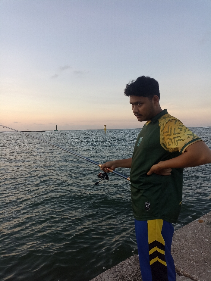 An adult male stands on a concrete pier or seawall, engaged in fishing, in Lhokseumawe, Indonesia