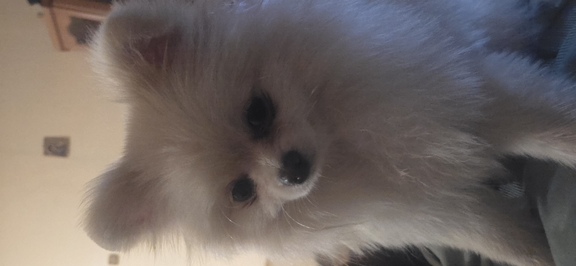 - "The scene depicts a small, light-colored canine, consistent with a Pomeranian breed, positioned in an indoor domestic environment within the city of Unknown, Unknown" by FM-o6gJl1, licensed under CC BY 4.0
