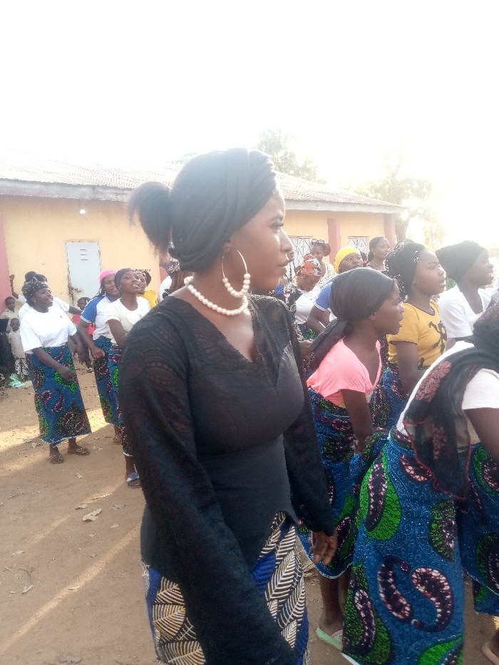 A group of women in matching skirts and headscarves are gathered outdoors. One woman is prominently featured, wearing a black, long-sleeved top, a pearl necklace, and large hoop earrings. She has a dark headwrap and a ponytail. The other women wear a mix of white, yellow, and pink shirts. A beige building is in the background on the left. The sky is overcast and bright, suggesting daylight.