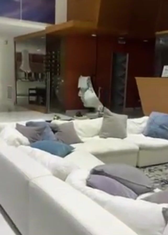 The video showcases an interior space featuring a large white sectional sofa adorned with an array of pillows in shades of white, gray, and blue. Positioned atop the sofa, a collection of decorative items catches the eye. Among these is a striking head sculpture, characterized by its reflective, mosaic-like surface, which rests on a small stack of books. Nearby, a dark chain-like art piece adds visual interest. The surrounding room boasts high ceilings and expansive windows that overlook a twilight-lit landscape. The interior decor includes contemporary elements, such as the sofa's clean lines and the artistic pieces displayed, suggesting a modern and stylish living space.