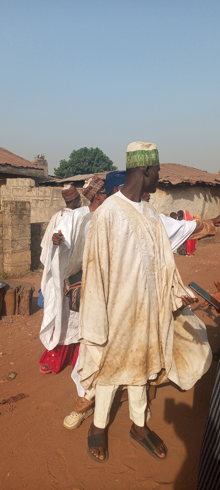 The image depicts an outdoor scene in Doma, Nigeria, under a clear blue sky. The ground is unpaved, consisting of reddish-brown earth. In the foreground and mid-ground, approximately five adult males are present. The central figure, facing right, wears a cream-colored, long-sleeved traditional garment with embroidered details, light-colored trousers, and black sandals. He also wears a white cap with green embroidery. His garment displays dirt stains. He holds a dark, rectangular object, possibly a mobile phone or recording device, in his right hand. To his left, another male wears a white traditional garment, red patterned trousers, and red sandals, with a brown patterned cap. He carries a dark, patterned shoulder bag and has his right thumb raised. A third male, partially obscured, is visible behind him in similar attire. In the background, simple structures with corrugated metal roofs and unpainted walls are visible. A prominent green tree stands in the mid-background. On the far right, a hand is visible holding a black object with a ribbed surface, consistent with a microphone or recorder, directed towards the central figure. In the far right background, several individuals, including what appear to be children and adults in red garments, are visible near structures. A wooden stool and a blue object are present on the ground to the left.