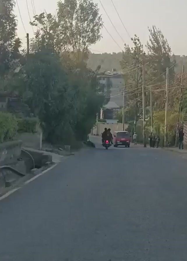 A car drives down a paved road. On the right sidewalk, a man walks ahead, and a woman in pink walks in the opposite direction. In the distance, a motorcycle follows a red car up the road toward a building. Power lines crisscross overhead amidst trees. The sky is overcast.