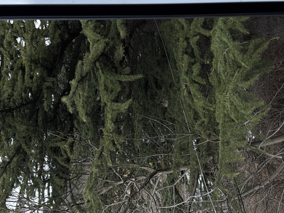The image displays a dense outdoor natural scene, observed from an interior vantage point through a window or door frame visible as a dark vertical band on the far right. The dominant feature is a large evergreen tree, likely a conifer, with numerous dark green, needle-covered branches filling the upper and central portions of the frame. To the left, several deciduous trees are visible with bare, intricate branches, suggesting a dormant season. A thin, light-colored utility wire extends horizontally across the lower-mid portion of the image, passing through the tree branches. Glimpses of a light, overcast sky are discernible through the foliage. No individuals or specific actions are present. The environment is consistent with a forested area within the city of Dilijan, Armenia.