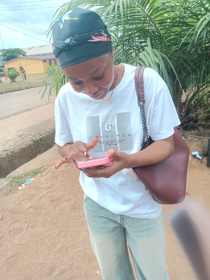 A young adult female stands outdoors in Owerri, Nigeria, on a reddish-brown dirt path adjacent to a narrow paved road