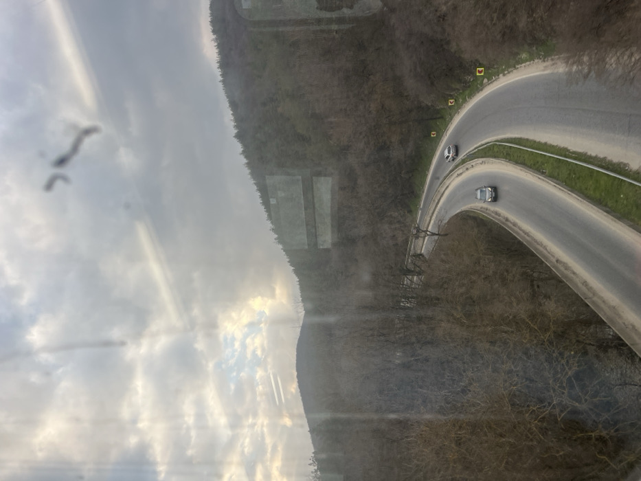 The image presents an elevated view of a curving two-lane asphalt road through a hilly, wooded area in Zmeyovo, Bulgaria, under an overcast sky. The road features a narrow median composed of dirt and sparse green grass, and is bordered by a concrete barrier on the left in the foreground. Multiple yellow chevron signs are positioned along the right side of the road, indicating a sharp curve. Two passenger vehicles are observed on the road, both traveling away from the viewer: a dark-colored SUV in the foreground on the left lane, and a light-colored SUV further ahead on the right lane. The surrounding hills are densely covered with deciduous trees, largely bare of foliage, suggesting a non-summer season. A cluster of darker evergreen trees is visible on the upper right hillside. The sky is predominantly cloudy, with brighter light visible in the upper left portion. The foreground of the image exhibits multiple linear reflections and irregular smudges on the viewing surface, consistent with a window or glass pane. No individuals are discernible.
