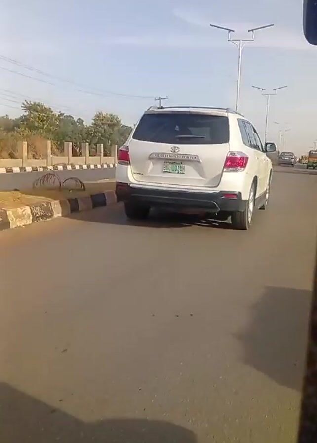 street scene captured from a moving vehicle, potentially an auto rickshaw. The main focus is on a white Toyota Highlander driving ahead in the same direction. The road is paved and has a central median strip. Other vehicles are present, including a black SUV and a green auto rickshaw. Streetlights are visible along the roadside. The sky is clear with a hint of haze. The video is slightly shaky due to the movement of the vehicle.
