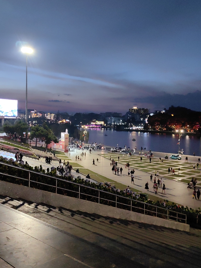 The image depicts an elevated view of Xuan Huong Lake and its surrounding promenade in Da Lat, Vietnam, at dusk or early night. In the foreground, concrete steps or sloped seating areas are visible, featuring dark grey surfaces and horizontal grooves, with a metal railing running diagonally across the lower right. Shadows from this railing are cast sharply onto the concrete. Immediately beyond the railing, a landscaped area with green shrubbery and purple flowering plants (likely hydrangeas) borders a wide, paved promenade. The promenade, located centrally, is illuminated and populated by numerous pedestrians, singly and in groups, walking, standing, and interacting. It features a distinctive checkered pattern of light-colored squares (possibly grass or decorative paving) set within darker paving. To the left, a large, brightly lit digital billboard displays light blue and white content, adjacent to a tall street light pole with a single, intense white luminaire. Along the lake's edge, several vehicles, including cars and what appear to be horse-drawn carriages, are present. Multiple illuminated boats are visible on the dark surface of Xuan Huong Lake. The far bank of the lake is lined with numerous buildings and structures, densely illuminated with various artificial lights, indicating an active urban cityscape extending towards distant hills under a dark blue and faint purple twilight sky. The overall scene is bustling with an estimated hundred or more individuals enjoying the evening atmosphere.