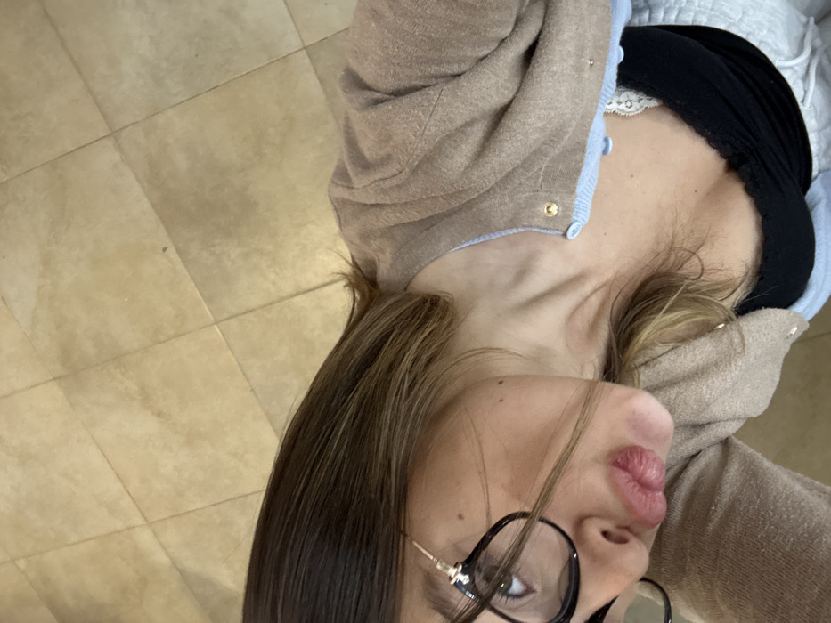 The scene captures an angled, close-up view of an individual, located in Be’er-Sheva, Israel. The subject, an adult female with light brown hair, is wearing black-framed eyeglasses with gold-accented temples and has her lips pursed towards the lower-left of the frame. Her attire consists of a partially unbuttoned light brown cardigan worn over a light blue garment, which in turn covers a black top featuring white lace trim along its upper edge. A light-colored garment is partially visible at the bottom right. The background consists of light-toned square floor tiles with dark grout lines.