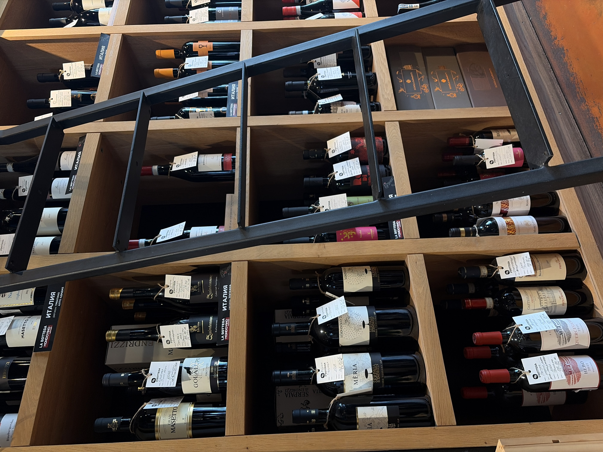 display of wine bottles on wooden shelves, likely in a store or wine cellar. The shelves are organized into compartments, each holding multiple bottles of wine. Most bottles have price tags attached. A black metal structure, possibly part of a ladder or decorative element, diagonally crosses the frame, partially obscuring the view of the wine selection. The wines are predominantly red, with some bottles labeled with Italian names and regions like Toscana, Kaltern, and Chianti. Some wine labels are in Cyrillic script suggesting that the location might be in Bulgaria, which makes sense because one of the labels indicates "LA BOTTEGA MONDOVINO" which has a location in Sofia, Bulgaria.