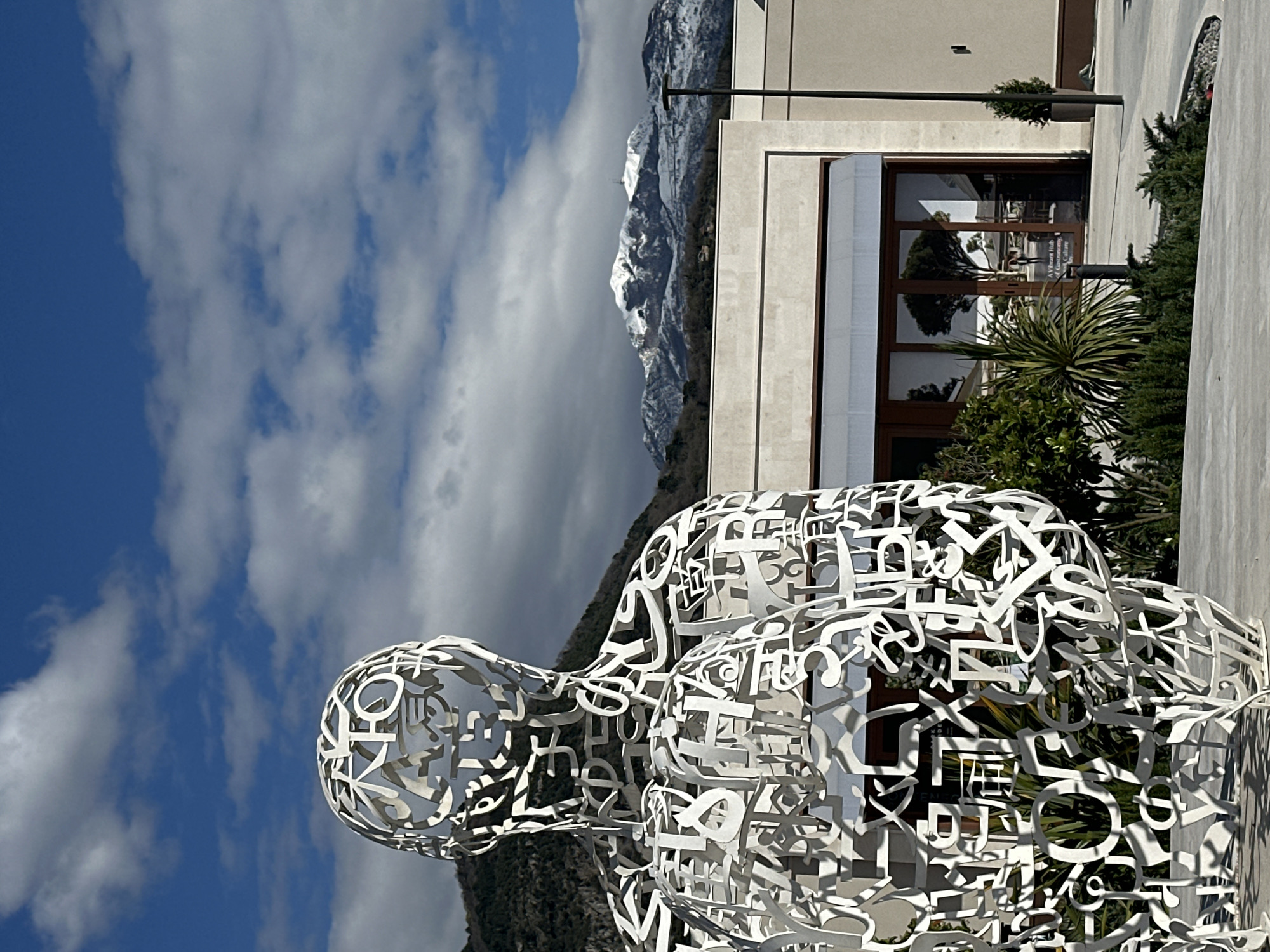 A large, white, abstract metal sculpture in the form of two figures seated together is positioned in front of a building with large glass windows. The sculpture appears to be constructed from cut-out letters and symbols. Behind the building, mountains with snow-capped peaks are visible under a cloudy sky. The scene is taken outdoors, with vegetation surrounding the base of the building. The location is likely Tivat, Montenegro, as the building's architecture and mountainous backdrop are characteristic of the region.