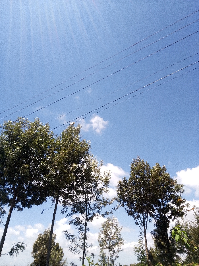 The image depicts an outdoor scene in Nachu ward, Kenya, dominated by a clear blue sky with scattered white cumulus clouds. Sunbeams emanate from the upper left. Four dark, parallel electrical wires stretch across the mid-upper portion of the frame, traversing horizontally from left to right. A small, light-colored bird is perched on the second lowest of these wires, positioned above the tree line. The lower two-thirds of the image feature a dense collection of trees varying in height and foliage, with the most prominent foreground trees exhibiting dark green canopies and slender trunks. No human figures or direct human actions are visible. The environment appears natural or semi-rural, characterized by overhead power lines and abundant vegetation.