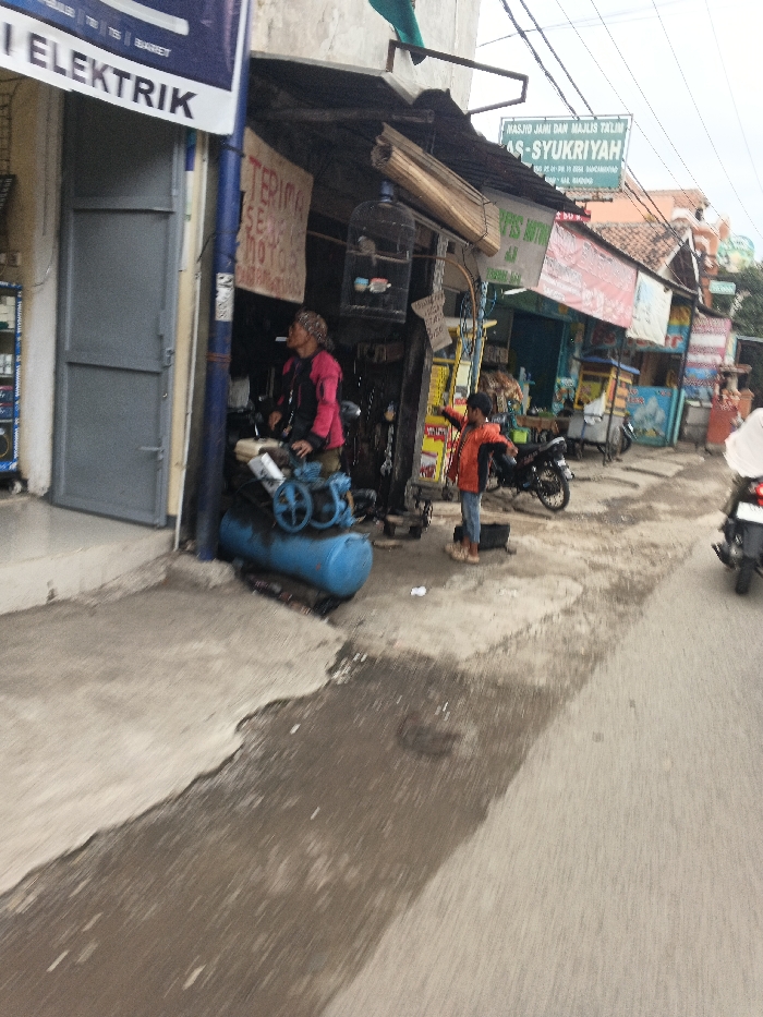 The image captures a street scene in Cangkuang Kulon, Indonesia. The foreground consists of an uneven concrete sidewalk on the left, transitioning to an asphalt road on the right, both exhibiting wet patches and scattered debris. On the left, a building with a white banner displaying "ELEKTRIK" and a grey metal double door is partially visible. Immediately adjacent, an open-fronted commercial establishment features a sign reading "TERIMA SEJU MOTOR" (likely indicating motorcycle service) and a hanging birdcage. A blue air compressor rests on the sidewalk directly in front of this stall. An adult individual, possibly female, wearing a pink jacket and a head covering, stands within the doorway of the open-fronted stall, looking towards the right. To her right, a young child, dressed in an orange and black jacket, light blue jeans, and brown shoes, stands on the sidewalk with both arms extended and pointing towards the right. Further along the street, multiple other shops or stalls with various signs are present. A prominent green sign overhead reads "MASJID JAMI DAN MAJLIS TA'LIM AS-SYUKRIYAH." A black motorcycle is parked on the sidewalk near the child. Towards the right side of the frame, a partially visible motorcycle with a rider appears to be moving away from the viewer on the road. Overhead electrical wires are visible against an overcast sky.