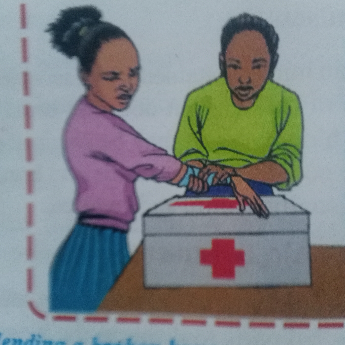 This illustration depicts a first-aid scenario occurring in an unidentifiable indoor setting within Lagos, Nigeria