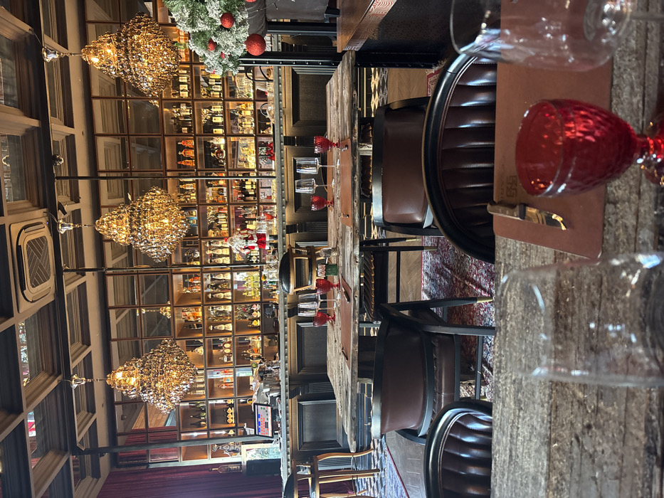 The image depicts the interior of a sophisticated restaurant or bar in Ulcinj - Ulqin, Montenegro. The scene is presented from the perspective of a seated patron at a rustic wooden table in the foreground, out of focus, showing a clear wine glass, a red stemmed glass, and a knife on a brown placemat. In the midground, a long, rough-hewn wooden communal table is set with multiple placemats, each prepared with a clear wine glass and a red stemmed glass. Brown leather-upholstered chairs with dark frames are positioned around this table, which rests on a patterned rug, possibly Persian-style. The background is dominated by a well-appointed bar area. A dark wooden bar counter extends across the width of the room. Behind it, an extensive shelving unit, constructed with a dark grid, displays a wide array of liquor bottles, uniformly lit with warm, ambient light. Two prominent, multi-tiered crystal chandeliers with warm-toned illumination hang from the ceiling over the bar area. On the bar counter, a computer monitor or POS system is visible on the left, and a small figurine of Santa Claus stands near the center. To the far right, a festive arrangement of faux pine branches adorned with red baubles suggests Christmas or holiday season decor. The ceiling features a dark, grid-like structure with an exposed air conditioning unit. Dark red drapery is visible along the left wall. No individuals are present in the scene.