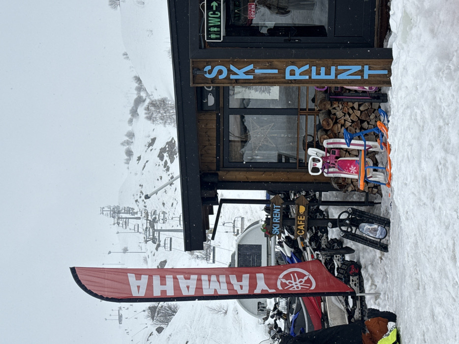 The image depicts a snowy winter scene at a ski resort facility in Kumlistsikhe, Georgia, under an overcast sky. In the background, snow-covered mountains rise, traversed by an ascending ski lift system with multiple chairs. Scattered bare trees are visible on the slopes. In the mid-ground, a single-story structure with a dark roof and dark-framed windows and door functions as a ski rental and cafe. A vertical wooden sign on the building displays "SKI RENT" in light blue lettering. Another illuminated green sign indicates "WC ->" with male and female symbols. A small red and white "OPEN" sign is affixed to the door. Above a window, a coffee cup icon is visible. To the left of the main entrance, a wooden directional sign with arrows points to "SKI RENT" and "CAFE" (with another coffee cup icon). A stack of chopped firewood is neatly piled against the building's exterior wall. Displayed directly in front of the building are various winter recreational items on the snow. These include a black sled, a pink child's snow scooter/sled with a snowflake design, and a blue child's snow scooter/sled. Skis and poles are also visible leaning against the building or alongside these items. To the left of the building, a large red vertical banner with "YAMAHA" written in white text and featuring the Yamaha logo is prominently displayed. Adjacent to the flag, several snowmobiles, including red and blue models, are parked on the snow. A person's lower leg, clad in yellow and green winter pants, is partially visible at the bottom left corner of the frame. Inside the building, dimly visible through the glass door, a reflection or internal decor resembling a large star is apparent, and a person in winter attire is faintly seen near the entrance.