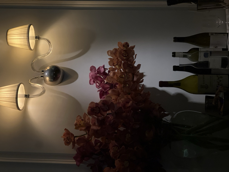 A softly lit room reveals a wall sconce with two pleated lampshades casting light and shadows. A vibrant arrangement of orchids in various shades of pink and peach sits centrally, partially obscuring a collection of wine bottles and a wine glass arranged on shelves against the wall. The scene is muted and elegant, with a balance of light and dark.
