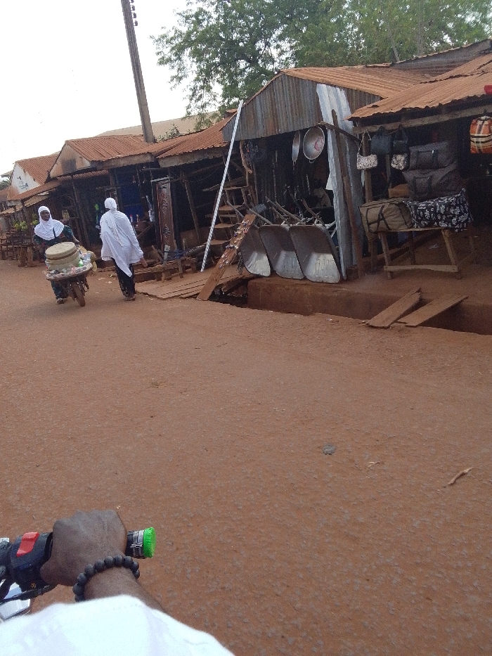 The image captures a street scene in Ankpa, Nigeria, from the perspective of a person on a motorcycle. The foreground displays a dark-skinned right hand, adorned with a dark beaded bracelet, gripping a black motorcycle handlebar with a green grip and a red button. The street is unpaved, consisting of reddish-brown dirt or laterite. Two individuals are positioned on the left side of the street, walking away from the camera. The lead person pushes a two-wheeled cart carrying multiple stacked cylindrical containers. This individual is dressed in a white head covering and a light-colored garment. Behind them, a second person walks, wearing a white full-body garment, a head covering, and dark trousers visible beneath the garment's hem. A row of commercial stalls or shops lines the right side of the street. These structures feature corrugated metal roofs, many exhibiting rust, supported by wooden frameworks. The nearest shop on the right displays three new, silver-colored wheelbarrow pans leaning against its exterior, with a large metal basin visible hanging inside. Adjacent to this, a second shop presents an assortment of bags, including handbags and larger travel bags, arranged on a wooden display stand. A utility pole rises in the mid-ground towards the left, with multiple wires extending upwards. Green tree foliage is visible above the shop structures in the background. A raised divider, likely concrete or packed earth, separates the street from the shopfronts, with several wooden planks placed across its width. The sky is predominantly light-colored and overcast.