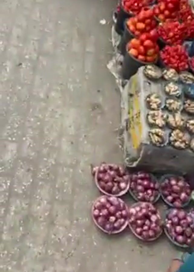bustling outdoor market with a variety of fresh produce on display. There are several people present, including vendors and customers. The primary items visible are arranged in neat rows on the ground and include large quantities of tomatoes in buckets and bowls, red onions in metal trays, ginger, Scotch bonnet peppers in metal bowls, okra, yams, and other various peppers. People are walking past the stalls. The general environment appears to be busy with vendors selling their goods.
