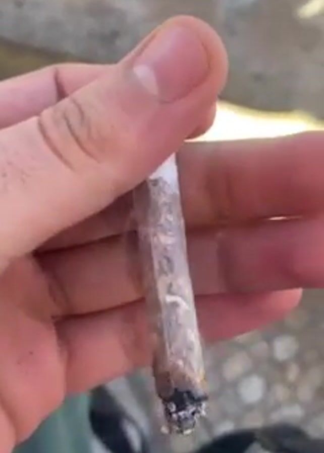 A hand holds a lit, partially smoked cigarette