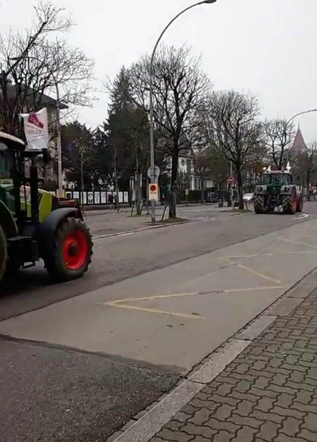 The scene shows a street in a town or city on an overcast day. Several green tractors with red wheels are driving down the street. Two people are walking along the sidewalk on the right side of the street. In the distance, there is a fire truck. Trees line the street, most of which are bare of leaves. Buildings are visible in the background. The sidewalk is paved with grey interlocking blocks. The road has yellow markings. There are streetlights along the street.