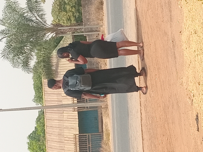 In Katcha, Nigeria, a daylight scene depicts two individuals standing on a dry, reddish-brown dirt roadside adjacent to a paved gray road. The individual on the left, identified as male, stands facing right, wearing a black t-shirt, a long black garment, and dark sandals. A gray and black backpack is worn on his back, and he holds a dark object in his left hand. The individual on the right, identified as female, stands slightly behind and to the right of the male, also facing right. She wears a form-fitting black dress and is barefoot. She holds a white translucent plastic bag in her left hand, and her right hand is raised near her ear. In the background, a single-story structure with a light-colored corrugated metal roof and a light blue section is visible behind a dark metal fence. Lush green vegetation, including a tall palm tree, borders the background under a bright sky. A utility pole extends vertically near the center of the frame, positioned between the two individuals and the background structure.