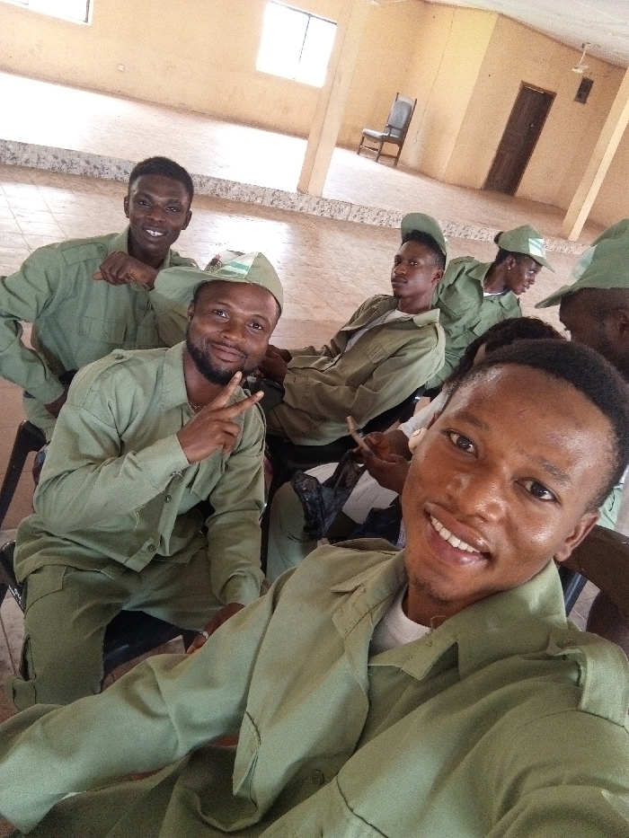 This image depicts a group of seven young adult males gathered inside a large, sparsely furnished hall, located in the city of Unknown, Unknown. All individuals are uniformly dressed in olive green long-sleeved shirts, trousers, and matching hats adorned with a distinct green and white striped emblem, consistent with a national service corps uniform. In the immediate foreground, a light-skinned male on the right, with short dark hair, smiles broadly directly at the camera, indicating he is taking the photograph. His uniform shirt is partially unbuttoned over a white undershirt. To his left, a dark-skinned male with a beard, wearing his uniform hat reversed, smiles and forms a "peace" sign with his right hand. Behind them, another dark-skinned male stands smiling, and a fourth male in uniform is seated, looking towards the right. Further in the background, at least three additional individuals in identical uniforms are partially visible, seated or standing, creating a relaxed group interaction. The environment features light-colored walls, possibly beige or pale yellow, and a tiled floor with a patterned border. Natural light illuminates the room through two large, uncurtained rectangular windows on the back-left wall. A dark brown wooden door is visible on the back-right wall. A single dark-colored wooden chair stands unoccupied in the distant background. The room's utilitarian appearance suggests a communal or institutional facility.
