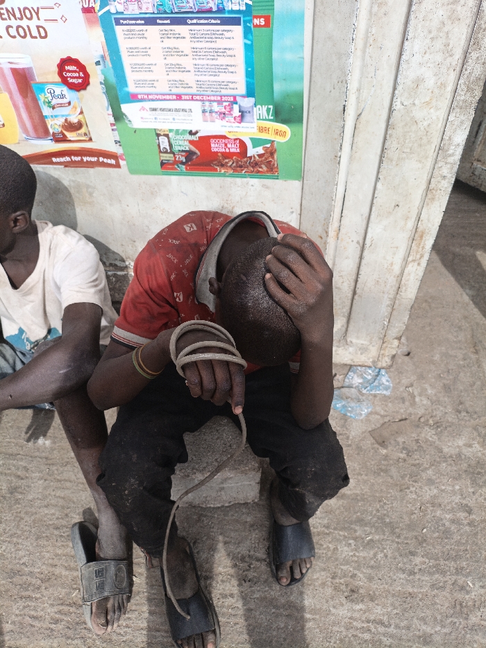 The scene depicts two young males seated on a concrete surface against a light-colored wall in Fagge C, Nigeria. The individual on the right, the primary subject, wears a red short-sleeved collared shirt patterned with "K" and "JACK" logos, and soiled dark trousers, along with dark slide sandals. Their head is bowed forward, with the right hand covering part of the forehead and face. The left hand holds a coiled length of light-colored rope or cord, and multiple thin, colored bangles are visible on the left wrist. To the left, a second individual is partially visible, wearing a light-colored t-shirt and dark pants/shorts, with a black slide sandal on their visible left foot. The wall behind them is adorned with multiple commercial posters; one on the left advertises "Peak" milk with "ENJOY COLD" text, and another central poster with a green background details a promotion ("8TH NOVEMBER - 31ST DECEMBER 2023") related to "AKZ" and various product categories. Below the green poster, an image of "Chocoballs" and other food items is present. To the far right, a vertical light-colored structure, possibly a door frame, is visible, and scattered clear plastic debris (likely water sachets) lies on the concrete ground. The scene is illuminated by daylight, casting subtle shadows.