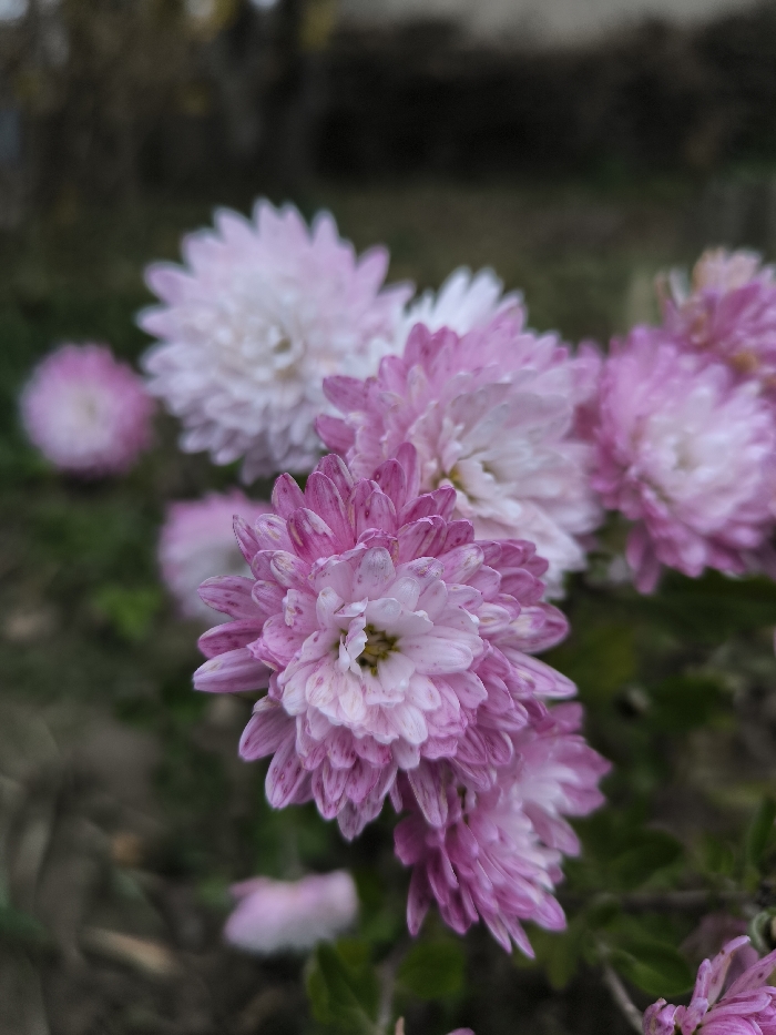 The image displays a close-up of several chrysanthemum flowers in Parkhomivka, Ukraine. The primary subject is a cluster of flowers in the foreground, exhibiting a bicolored pattern of pink and white. The outer petals are a distinct pink, transitioning to lighter pink and white towards the central, yellowish-white disks. The petals show fine texture and some visible darker pink speckling. Multiple other chrysanthemum blooms, similar in color, are present in the blurred background, indicating a shallow depth of field. The environment behind the flowers is out of focus, consisting of indistinct green foliage and brown ground cover. No human figures, animals, or artificial structures are visible.