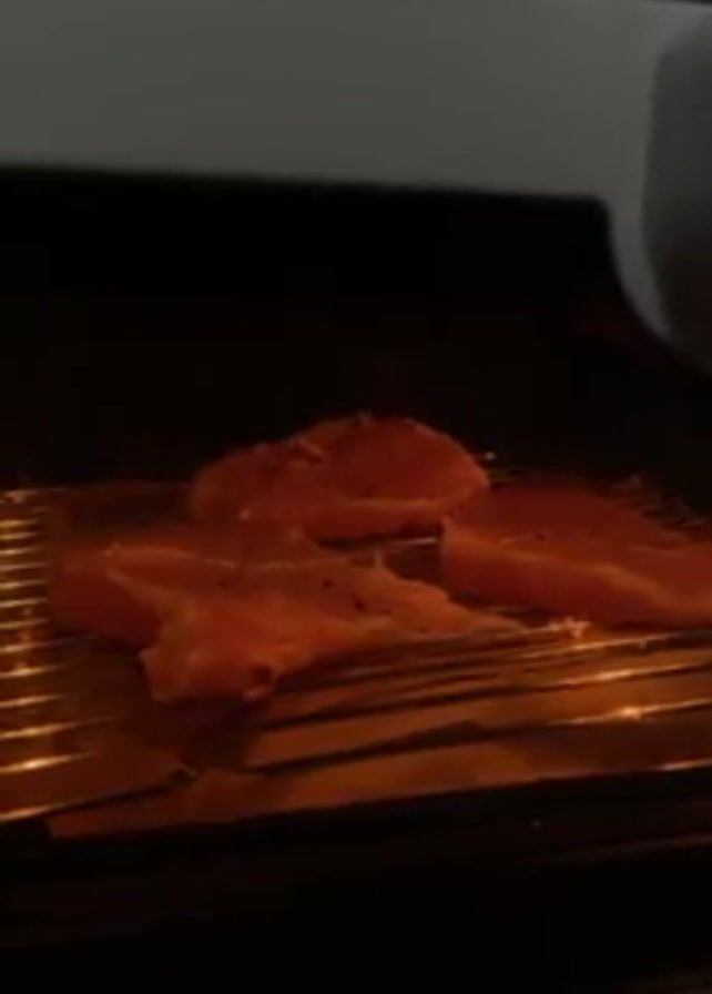 The camera shows a close up of an oven interior, where three pieces of seasoned salmon are baking on a wire rack placed over foil