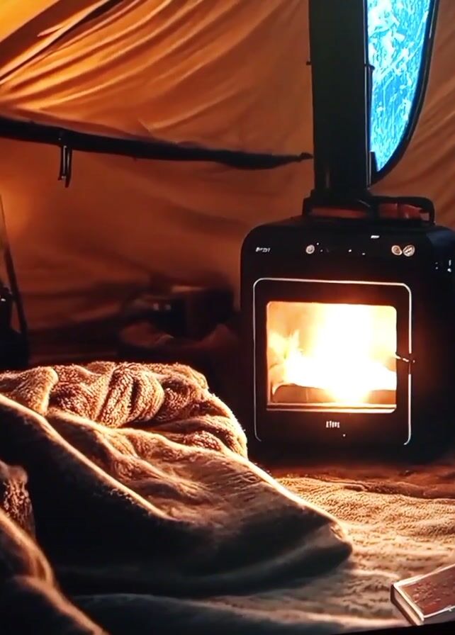 - "A medium shot reveals the interior of a tent, illuminated by warm light from a small wood-burning stove and a lantern" by FM-eTwu93, licensed under CC BY 4.0