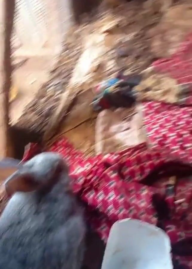 A video shows two rabbits in a wooden hutch. Initially, a grey rabbit sits on a wooden shelf with a white food dish nearby. The camera then shifts focus, panning down to the floor of the hutch where a red patterned cloth is spread. A black rabbit emerges, moving around the cloth-covered floor, near a terra cotta pot. The hutch walls appear to be constructed of rough wooden planks.