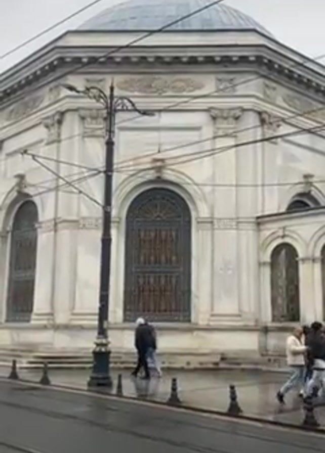 white, octagonal building with a blue dome and a crescent moon at the top, standing next to a wet street. People are walking on the sidewalk beside the building. Tram lines run along the street, and a tram support pole is visible. The day appears overcast.